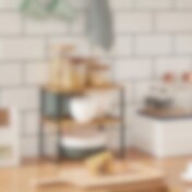 Hylly keittiön työtasolle - 2-pakkaus pinottavia ja säädettäviä hyllyjä puusta ja metallista