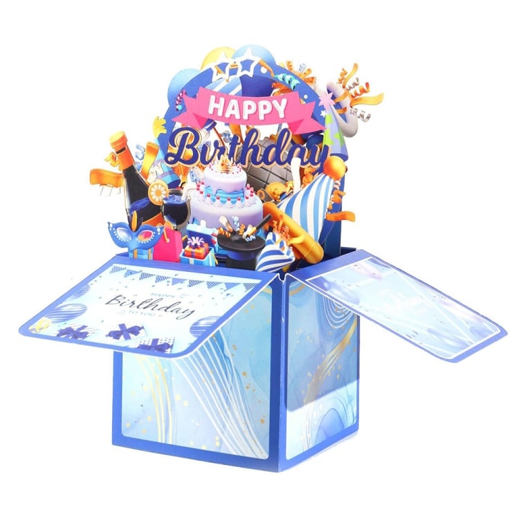 Värikäs 3D Happy Birthday -laatikko, jossa on pop-up-toiminto - sininen