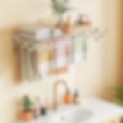 Bambusta valmistettu pyykkikori hyllyllä ja kahdella irrotettavalla pussilla – valkoinen/puu