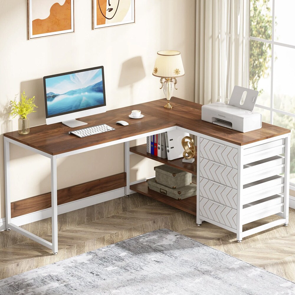 L-muotoinen työpöytä, jossa 4 laatikkoa ja 2 hyllyä – Valkoinen/Pähkinä