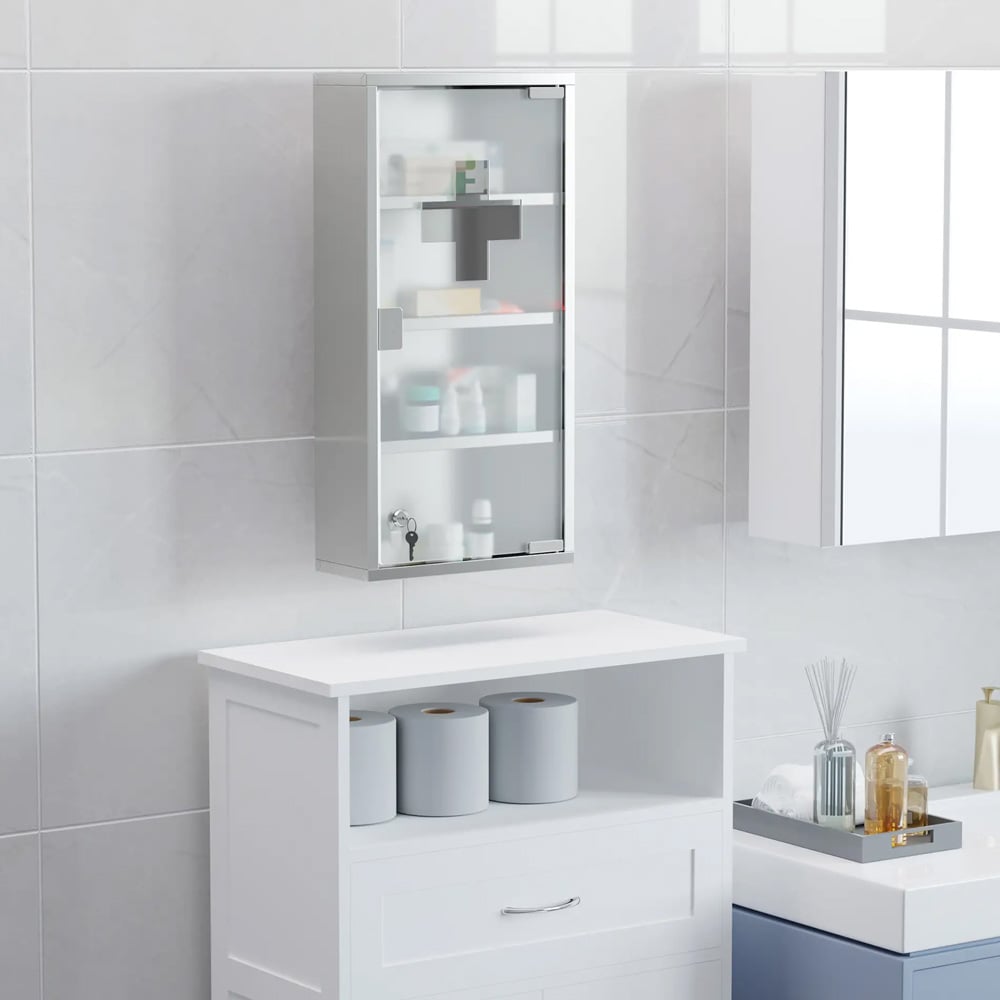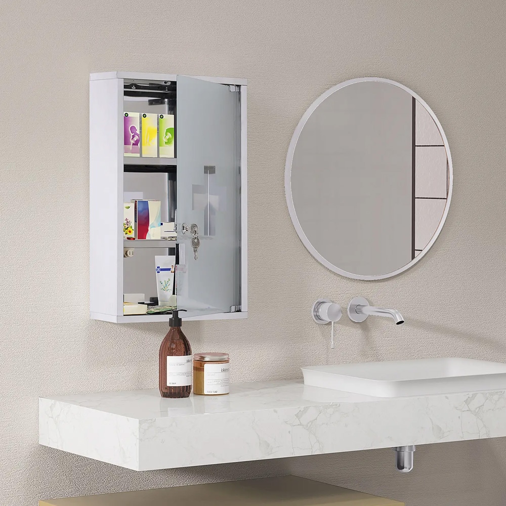 Lukittava lääkekaappi 3 hyllyllä / seinäasennettava teräksinen apteekkikaappi / kylpyhuoneen lääkekaappi - Valkoinen