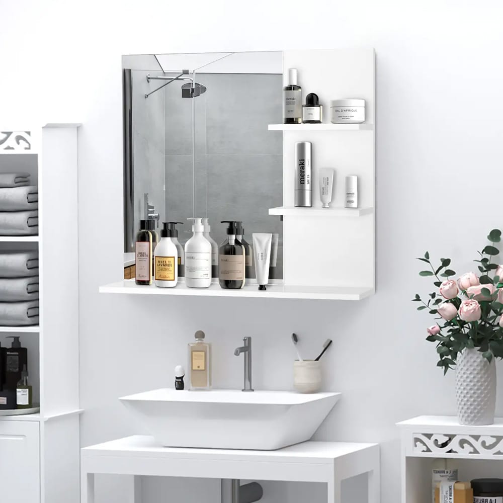 Kylpyhuoneen peili hyllyillä / seinäpeili säilytyksellä / peilikaappi, jossa 3 avointa hyllyä - Valkoinen