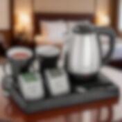 Vedenkeitin 1,2 L tervetuliaistarjottimella / tarjoilutarjotin kupeilla ja säilytyslokerolla / hotellitarjotin