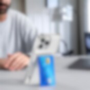 Takakuori korttipaikalla ja jalustalla iPhone 16 Pro Max -puhelimelle