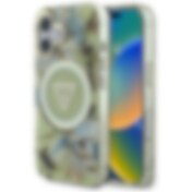 Guess Glitter Flowers Kolmio painikkeet MagSafe tapauksessa iPhone 16 vihreä