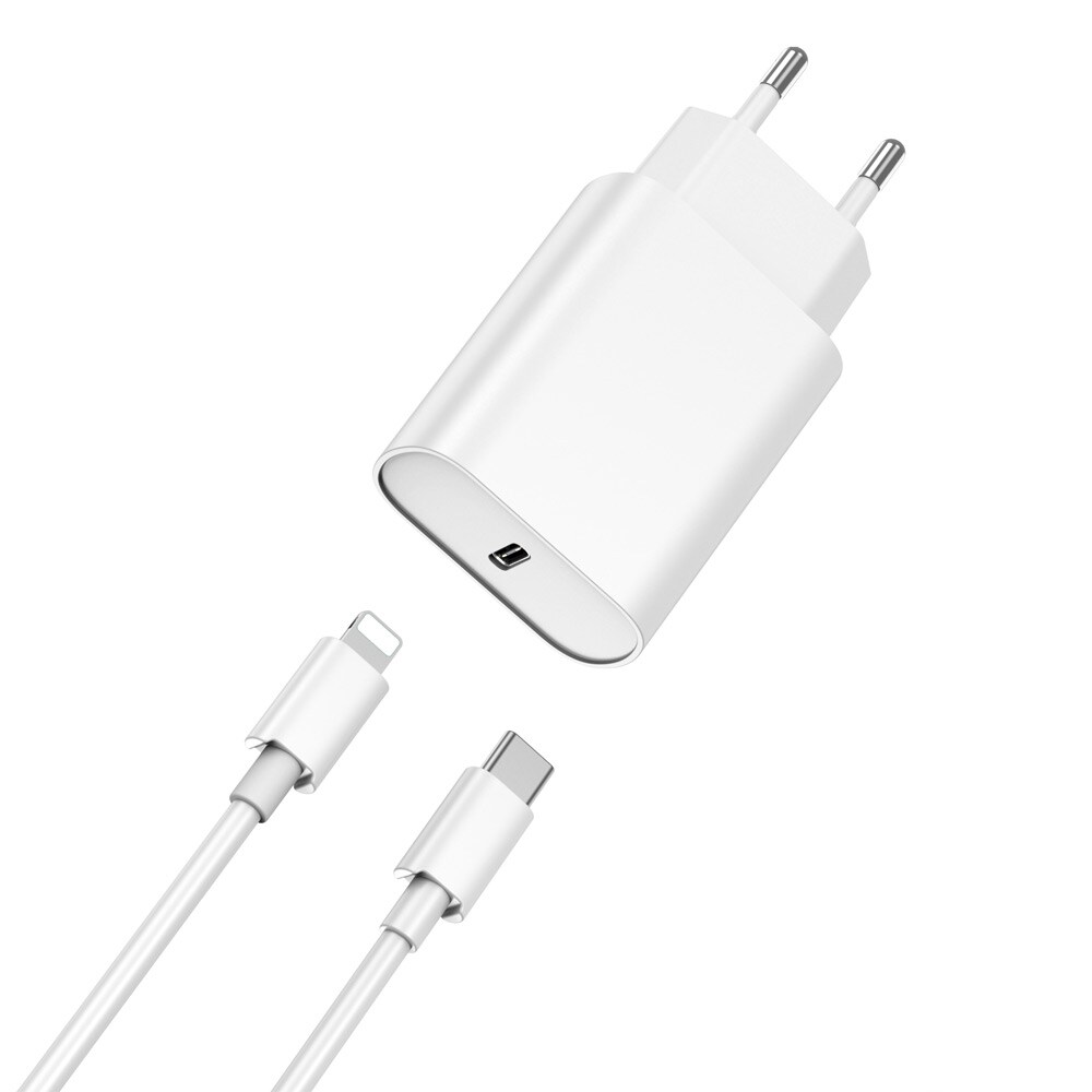 XO Seinälaturi 20W PD USB-C- ja USB-A-porteilla + USB-C–Lightning-kaapeli