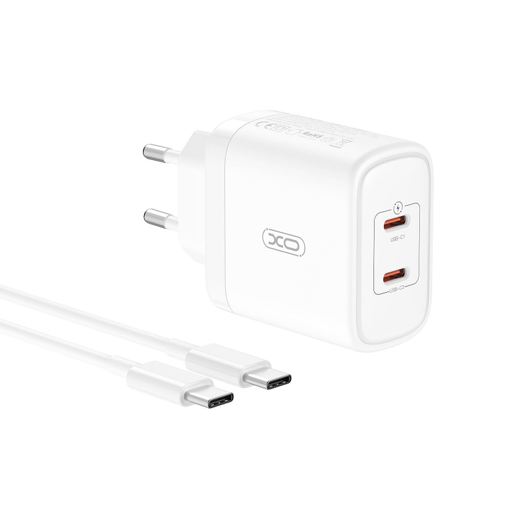 XO Seinälaturi 2xUSB 2.4A + USB-C-kaapeli - Valkoinen