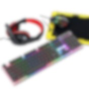 Pelipakkaus, jossa LED-näppäimistö, kuulokkeet, hiiri ja hiirimatto